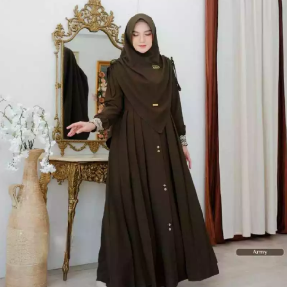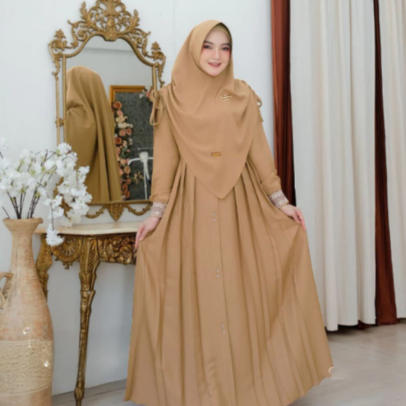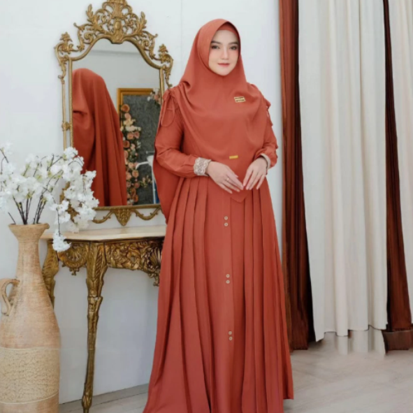 Perpaduan gamis dan khimar senada yang harmonis, menciptakan siluet anggun dan santun secara instan.